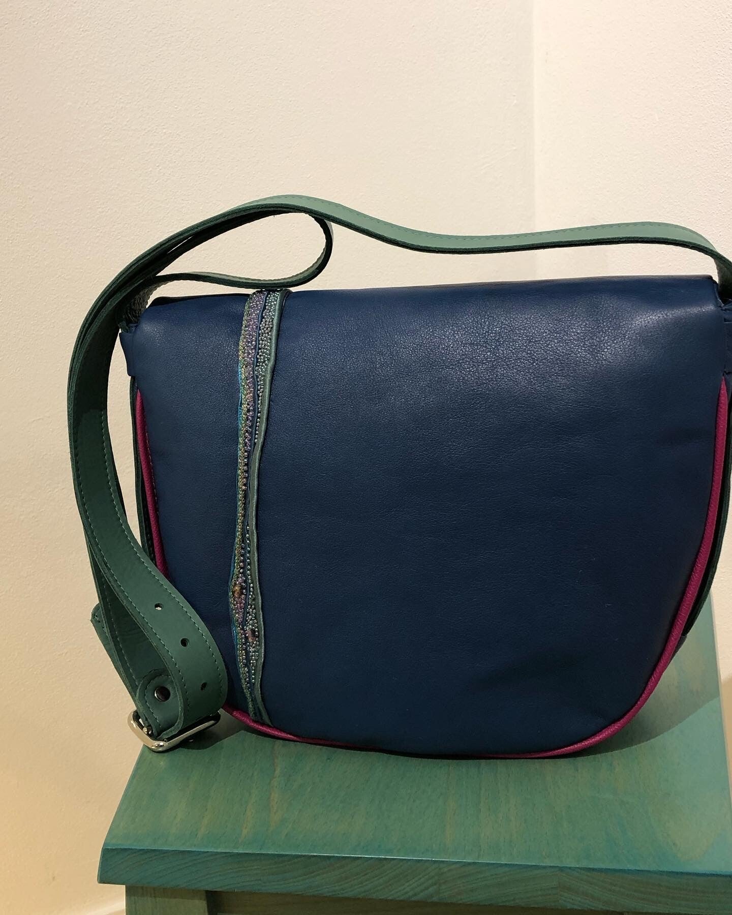 Een prachtig handgemaakt sieraad van Frans Beelen op de klep van de tas. Een unieke ruime schoudertas.